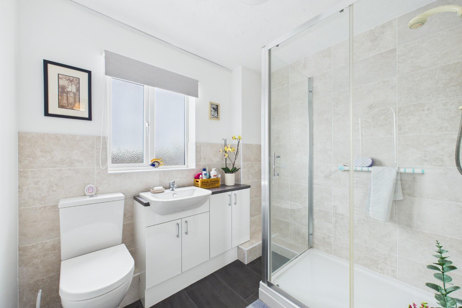 With a door leading from the hallway, WC, hand wash basin, walk in shower cubicle with full height tile surround, a double glazed window to the side and a central heating radiator