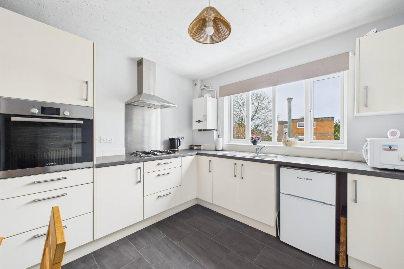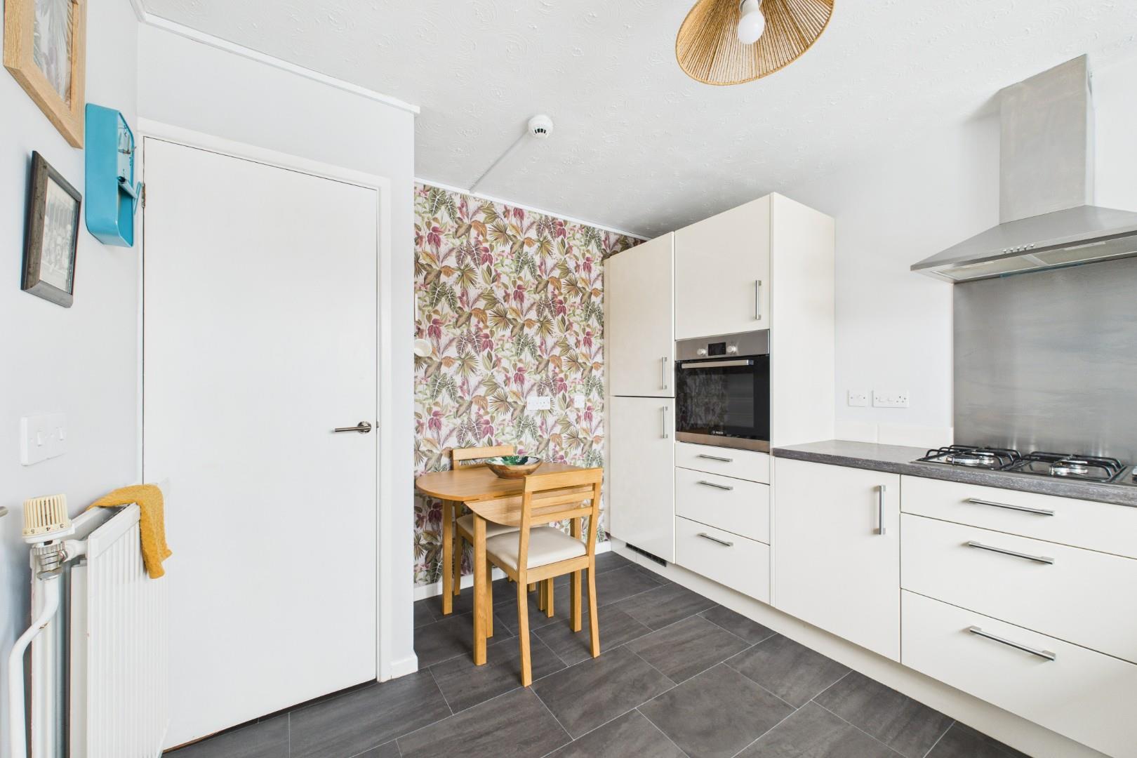 With a door leading from the living room, modern fitted kitchen with a range of wall and base units with worktops, integrated hob with stainless steel extractor hood, integrated oven, sink with mixer tap, access to 'larder' cupboard, a double glazed window to the front and a central heating radiator