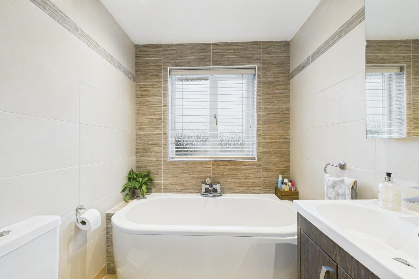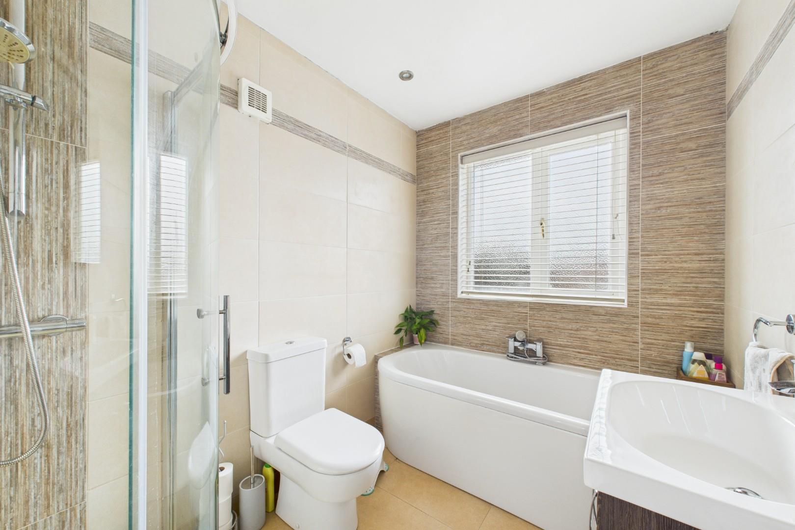 With a door leading from the landing, full height tile surround, WC, hand wash basin, bath with mixer tap and shower head, corner shower cubicle with glass screen, a double glazed window to the rear and a central heating radiator