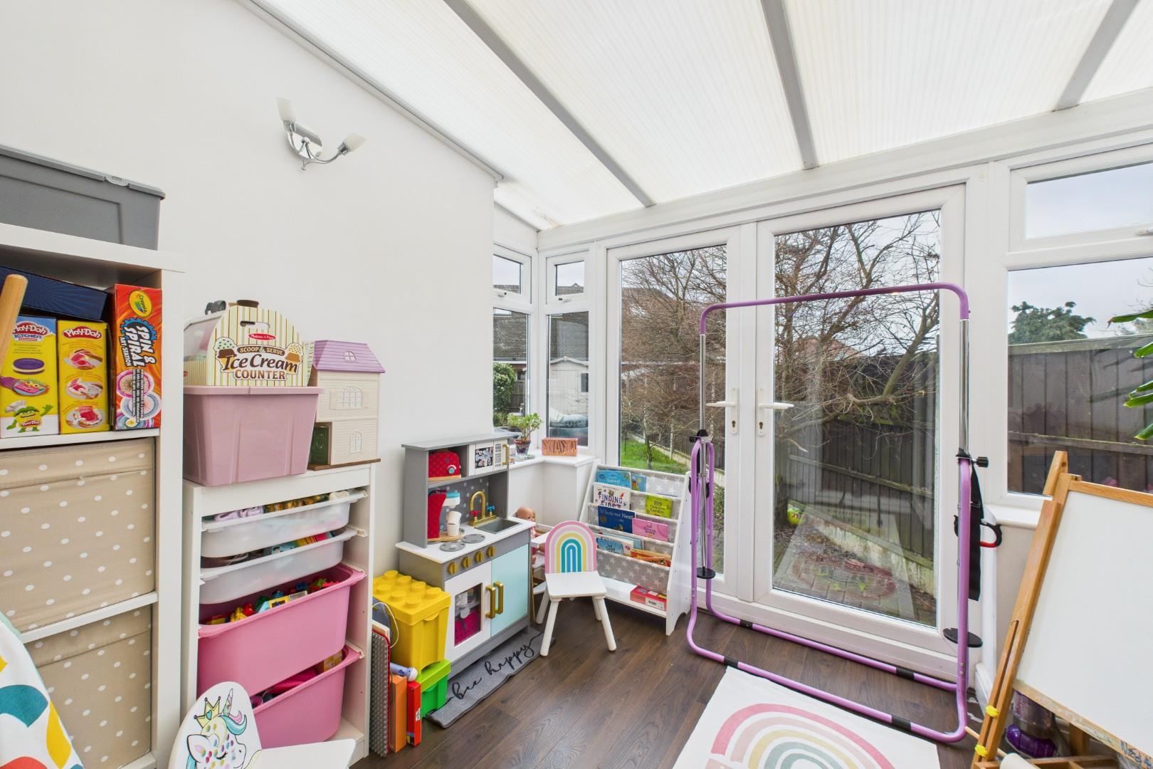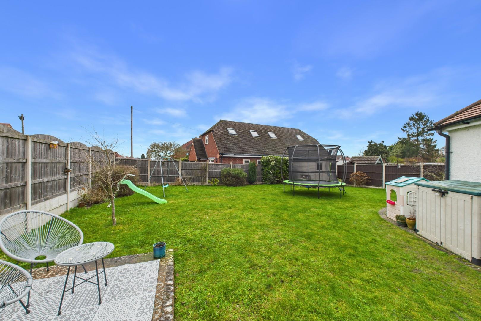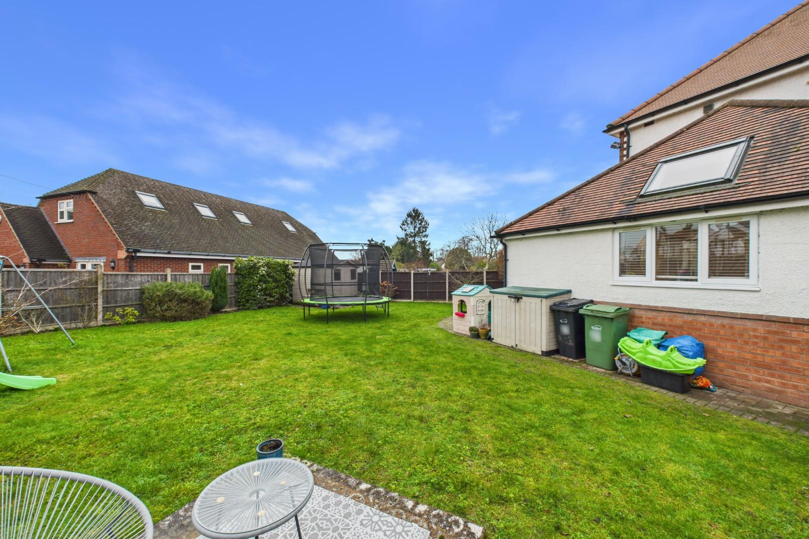 With doors leading from the kitchen and conservatory, patio area to the front with lawn beyond, side access gate to the front