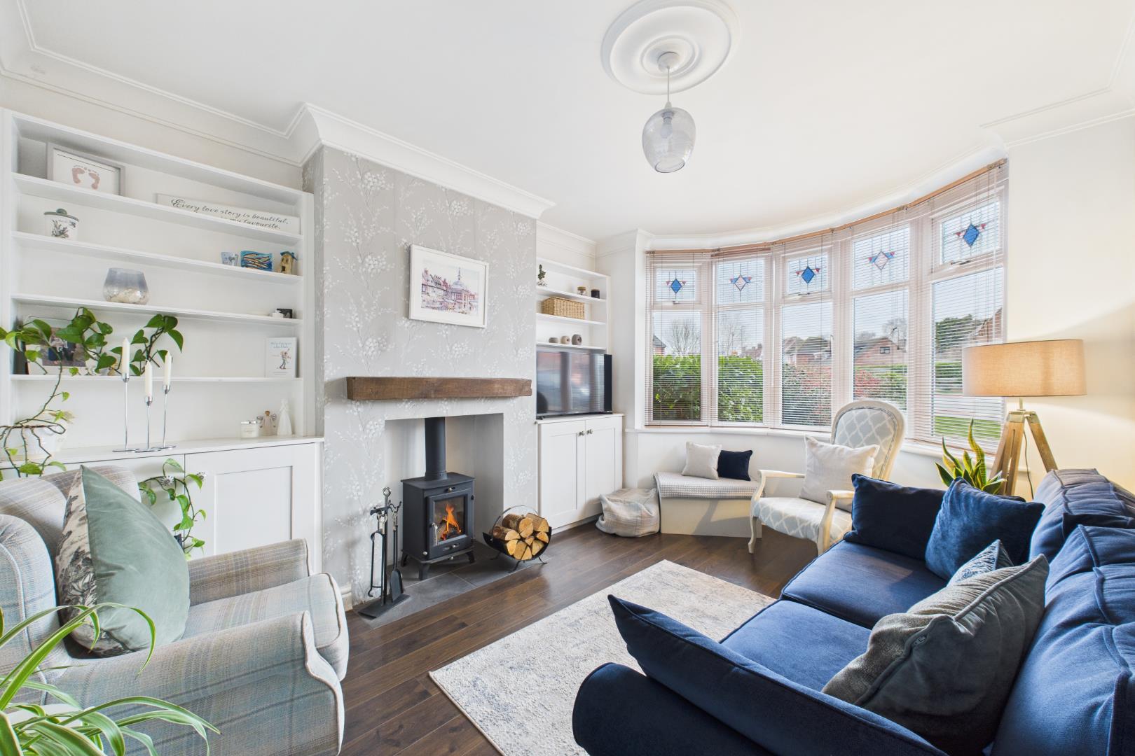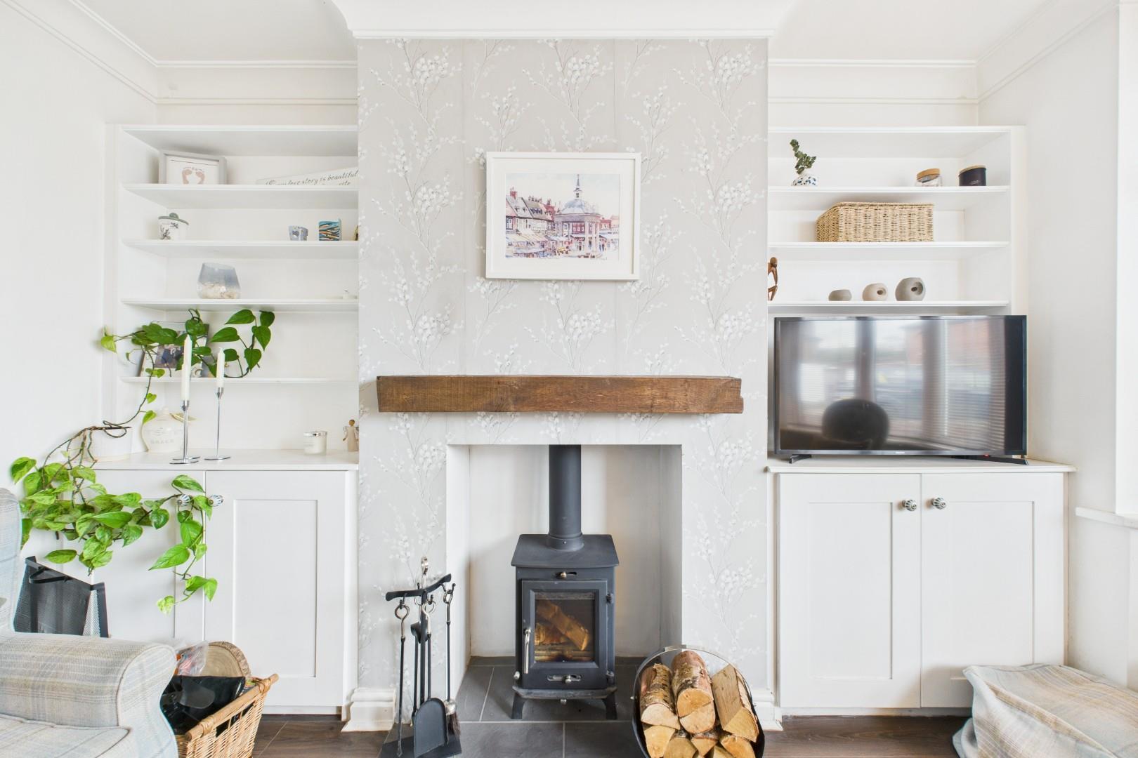 With a door leading from the entrance hall, fireplace with log-burning stove, mantel and hearth, built in alcove storage cupboards, a double glazed bay window to the front and a central heating radiator