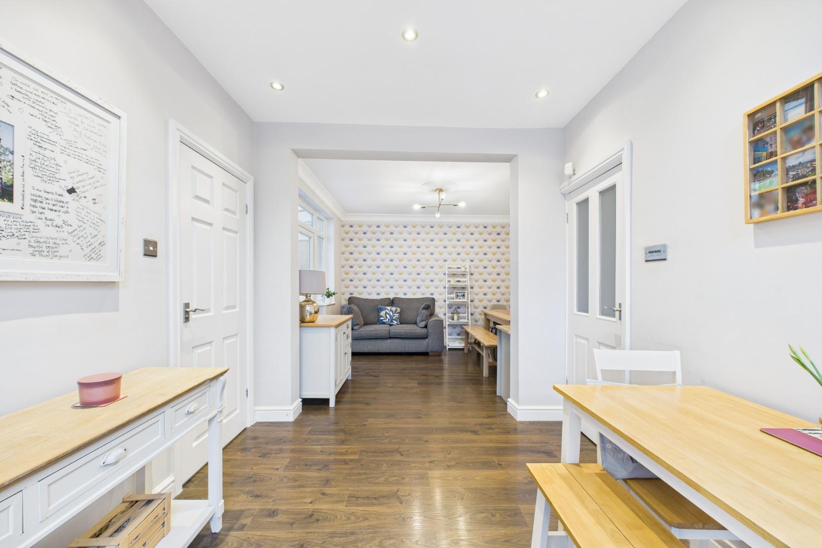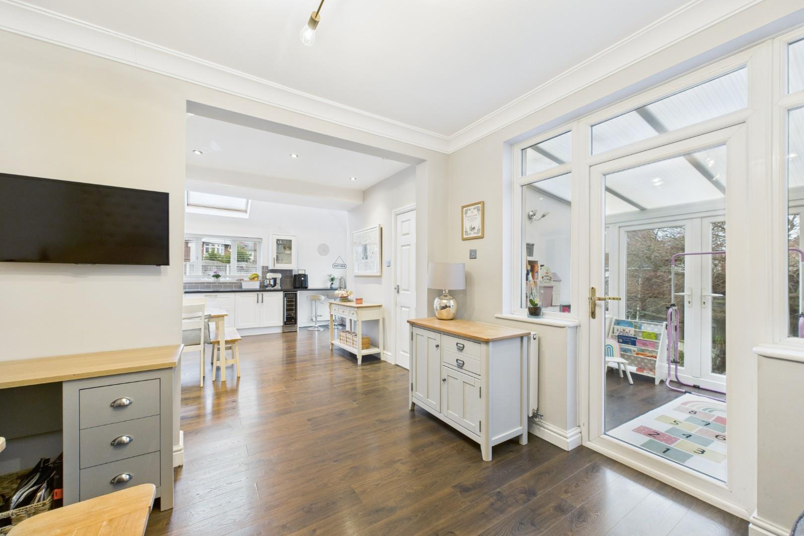 The ground floor offers a welcoming porch and entrance hall leading to a bay-fronted living room, providing a cosy and private reception space. To the rear, the property opens into a superb 27ft open-plan kitchen / lounge / dining area forming the true heart of the home. This generous space provides clearly defined cooking, dining and seating areas, ideal for entertaining and everyday family life.