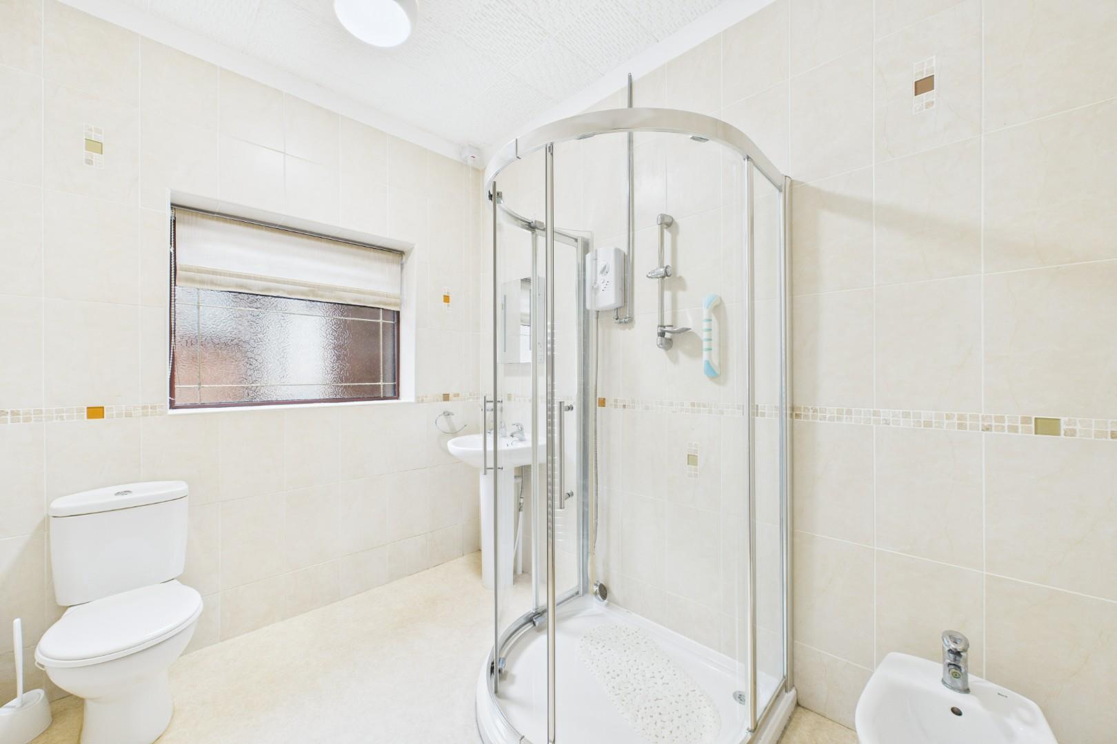 With a door leading from the entrance hall, full height tile surround, shower cubicle, WC, bidet, a loft hatch to the ceiling offering access to the loft storage, a double glazed window to the side and a central heating radiator