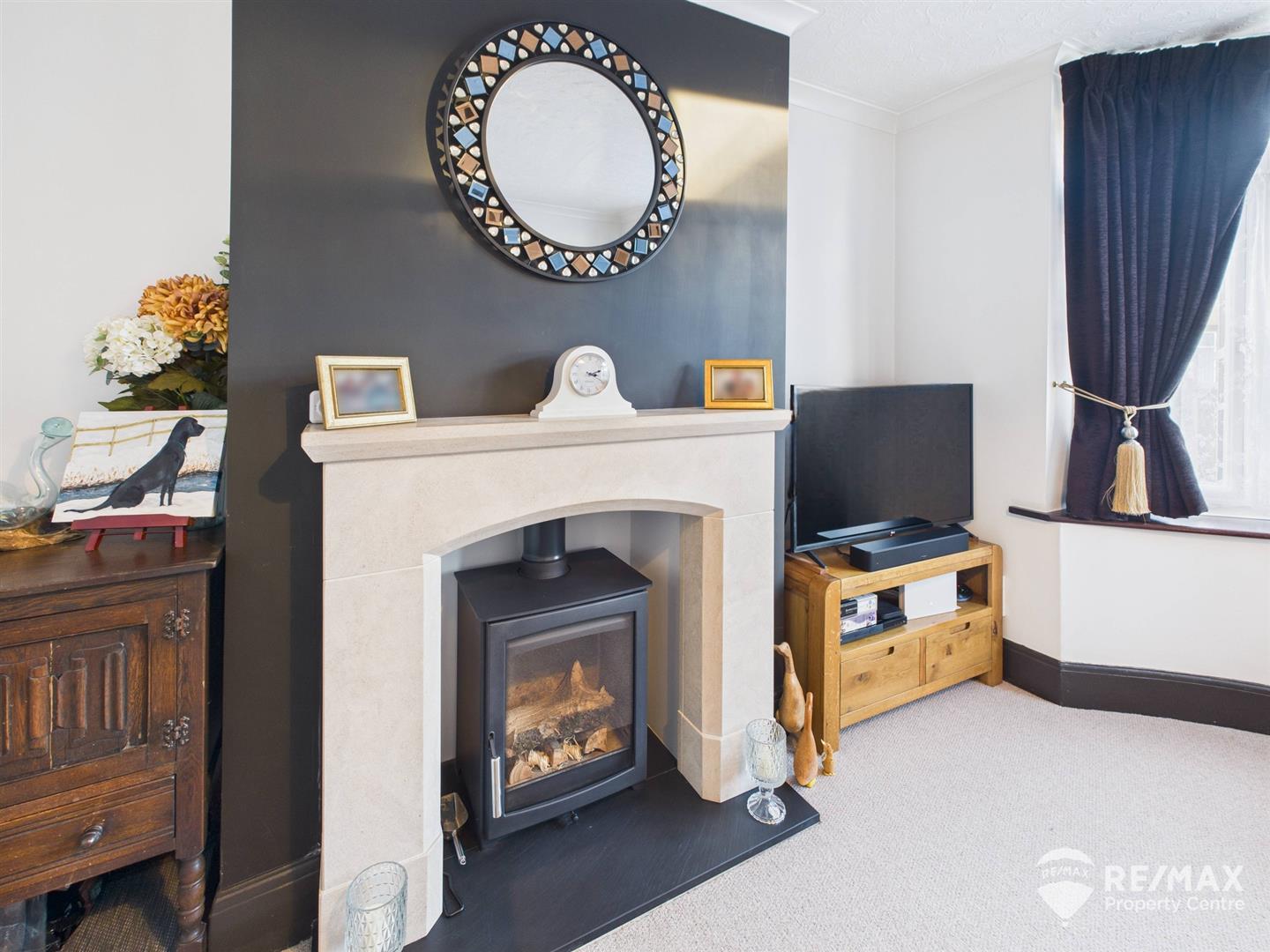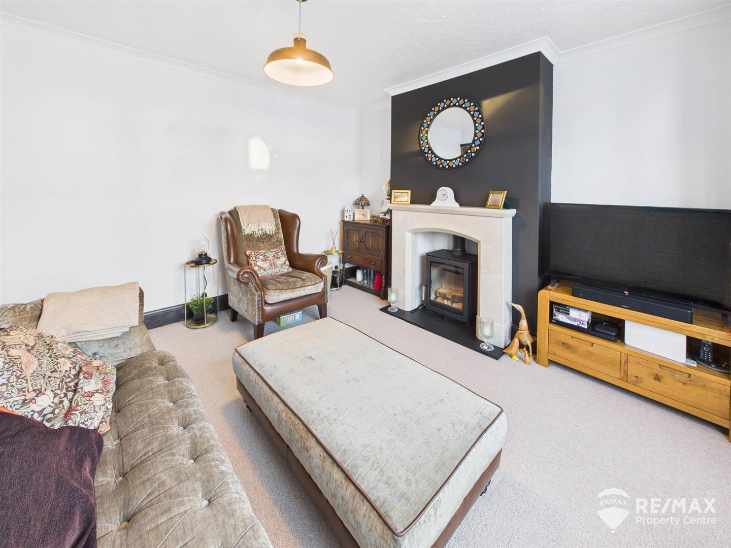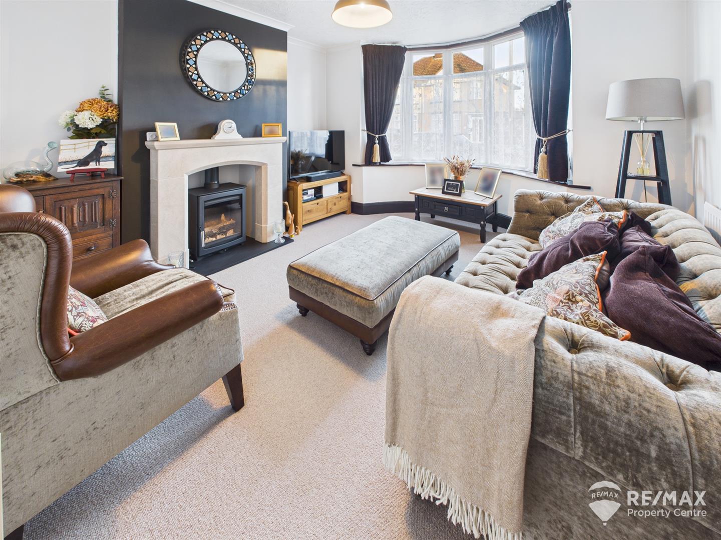 Featuring an Aegean Limestone fireplace surround housing the log burner (fully certified) and bay window to front aspect