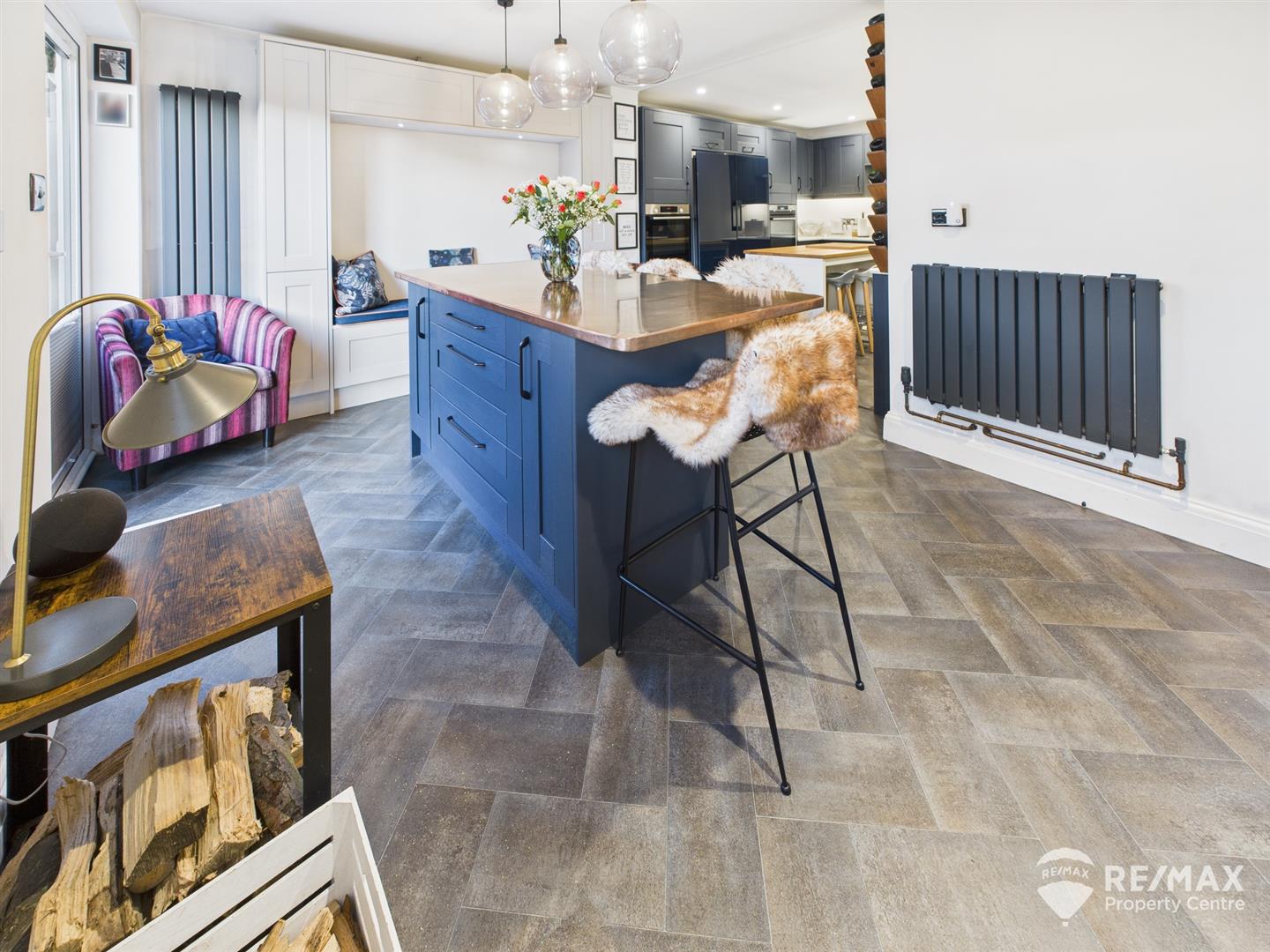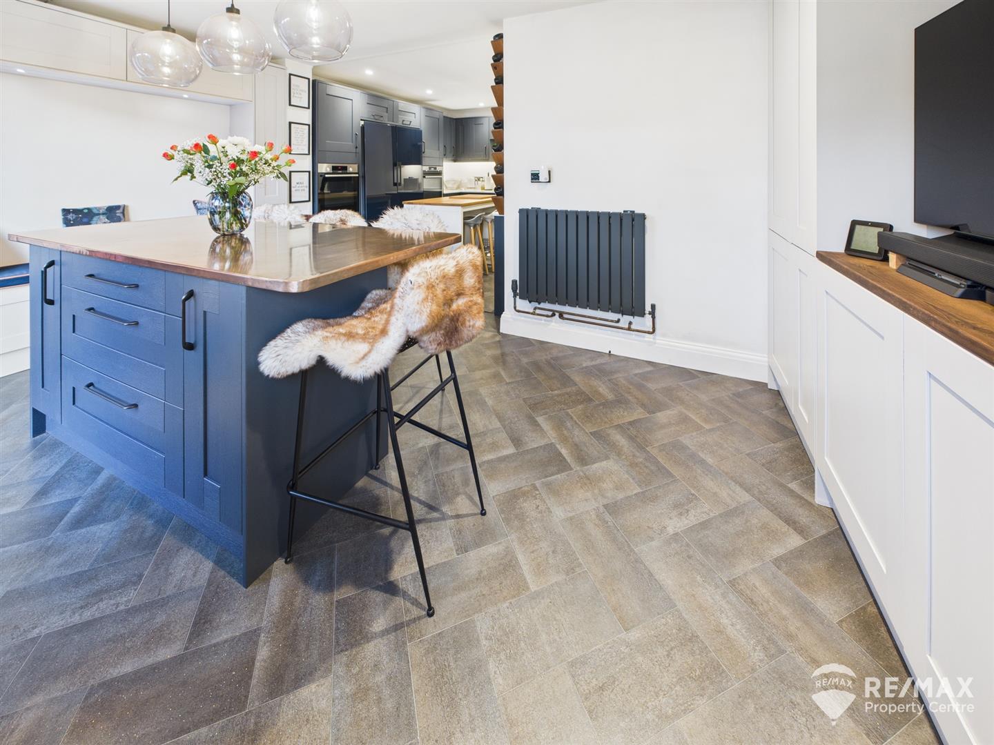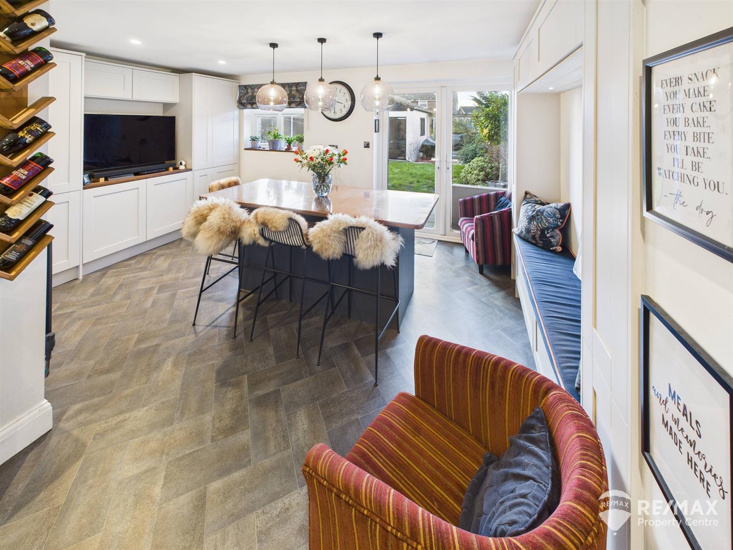 A perfect room for entertaining! with a central copper topped island with space for seating and storage cupboards below, built in alcove seating, media wall housing TV and surrounded by built in storage cupboards, cupboard housing gas boiler, window to rear aspect and French doors leading out to rear garden