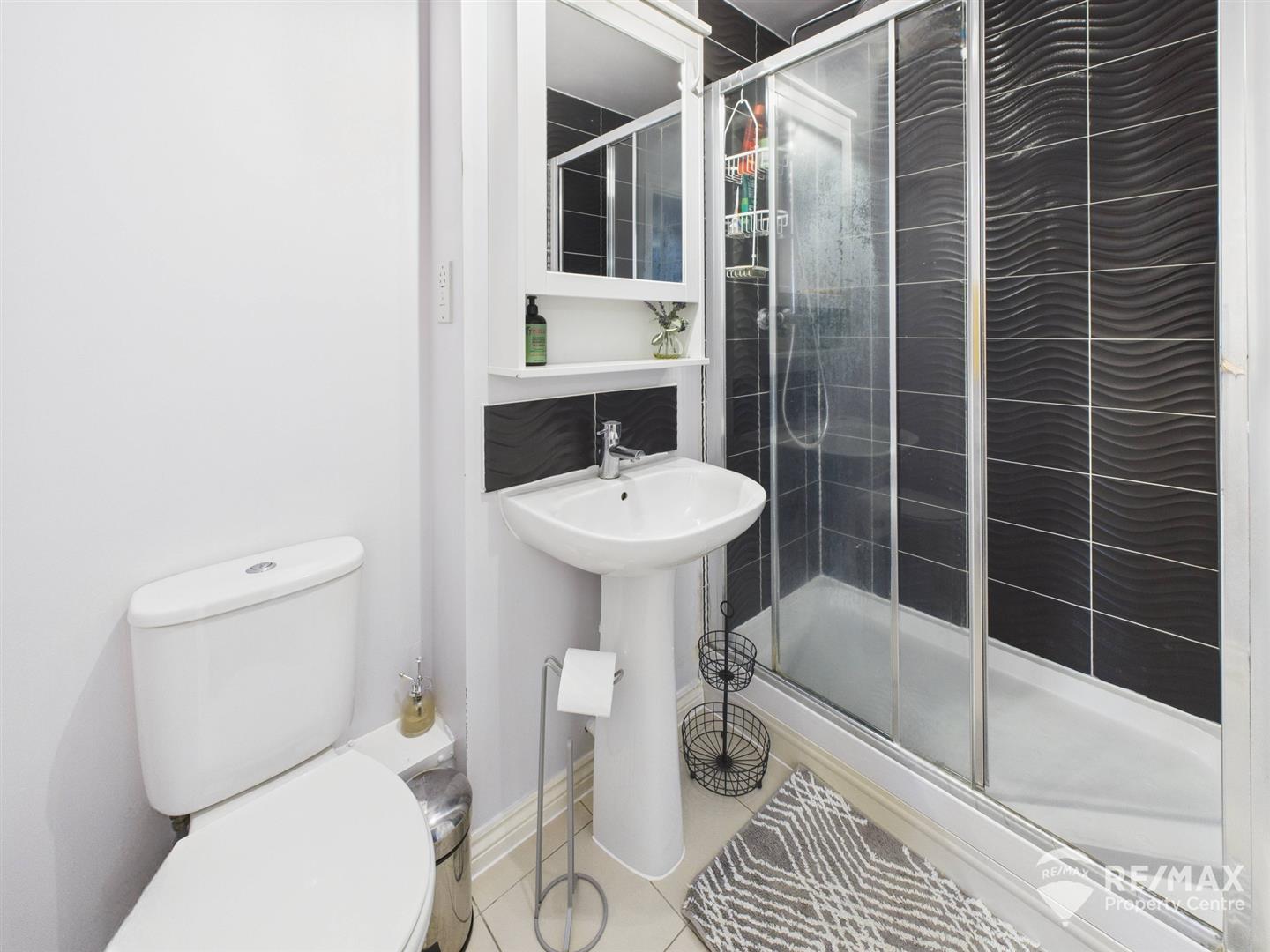 Suite comprising:- tiled shower cubicle, pedestal wash basin, low level WC, chrome wall mounted towel radiator, extractor