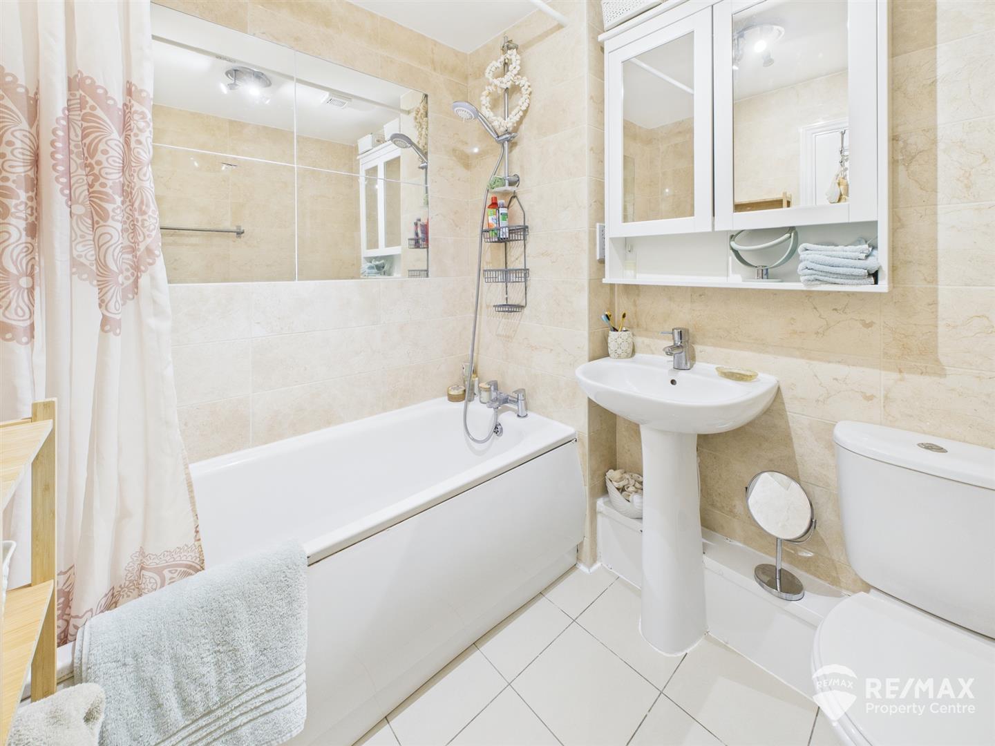 Modern suite comprising:- panelled bath with wall mounted shower, low level WC, pedestal wash basin, shaver point, fully tiled walls and chrome heated towel radiator