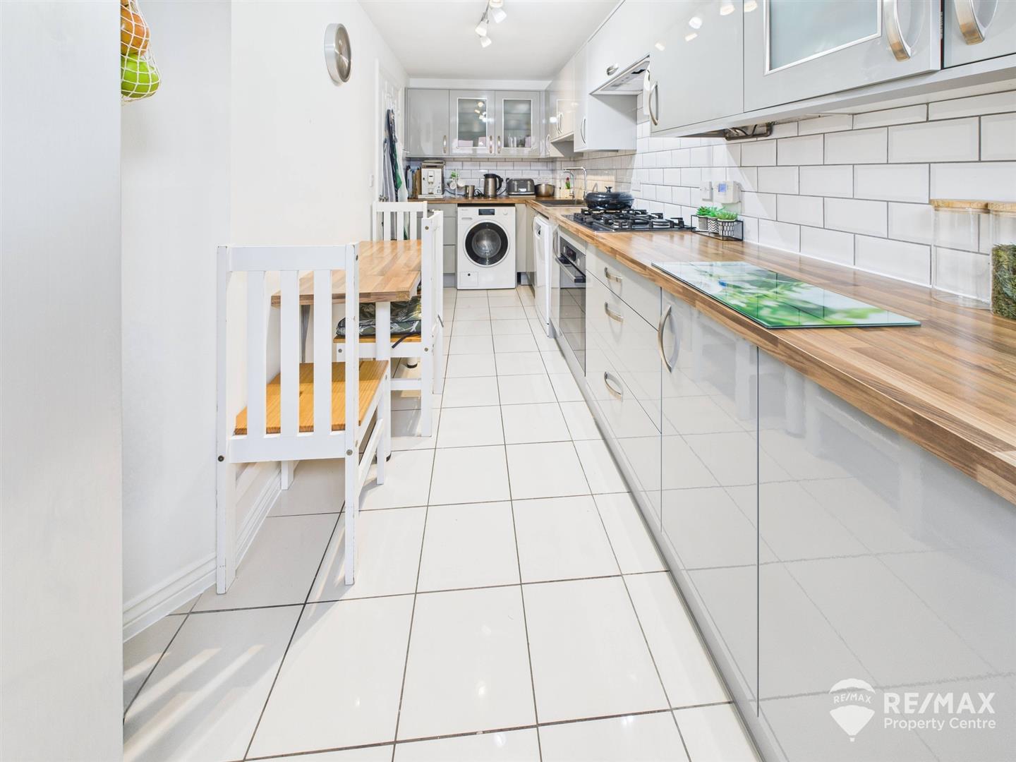 Well equipped with modern wall and base units, ceramic sink/drainer with mixer tap, built in oven, gas hob (5 ring) and extractor hood, spaces for washing machine & dishwasher, space for American style fridge/freezer, complimentary wall tiling and window to front aspect