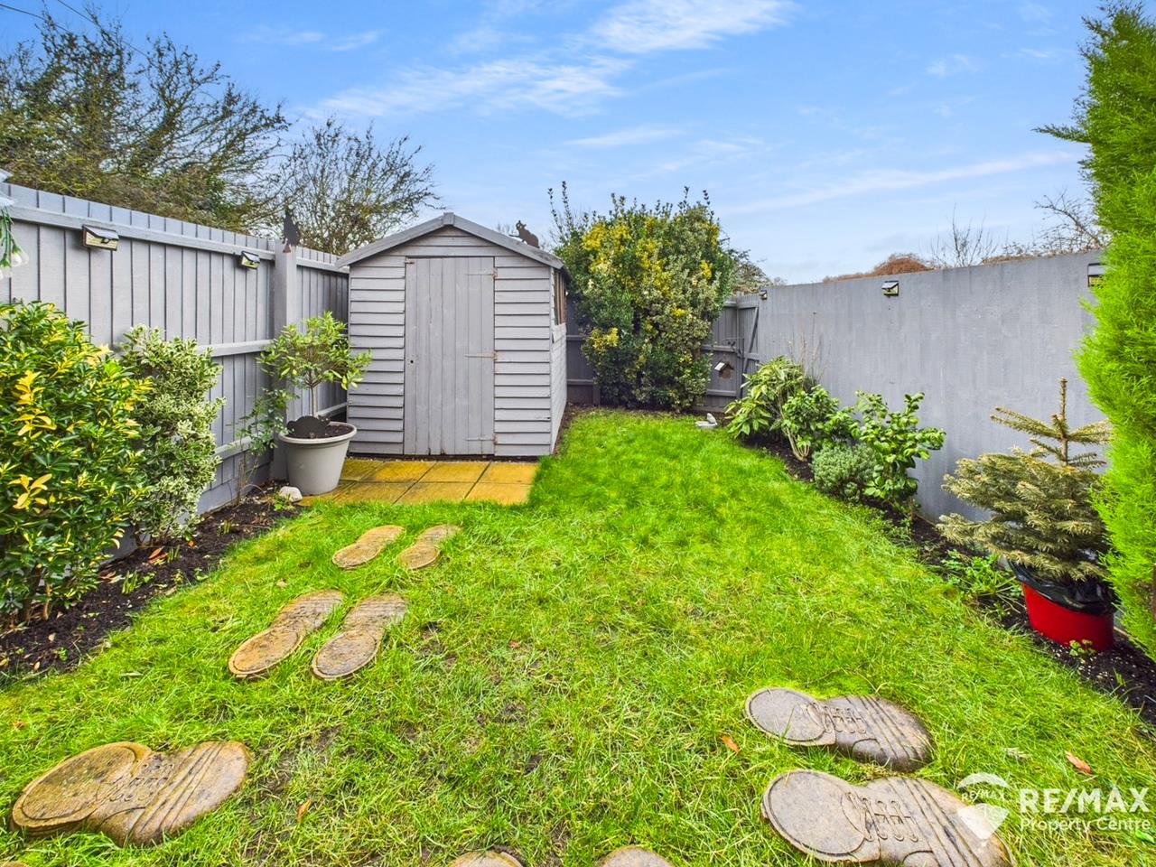 The charming rear garden is fully enclosed, mainly laid to lawn with established shrub borders to either side, wooden storage shed