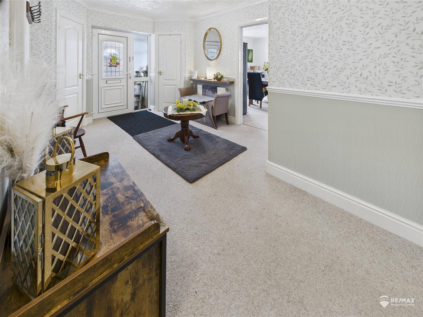 Spacious and welcoming, UPVC entrance door with stained glass and double sidelights, 2 storage cupboards, airing cupboard, loft access hatch, doors leading through to Lounge, kitchen, dining room, bathroom and bedroom 1