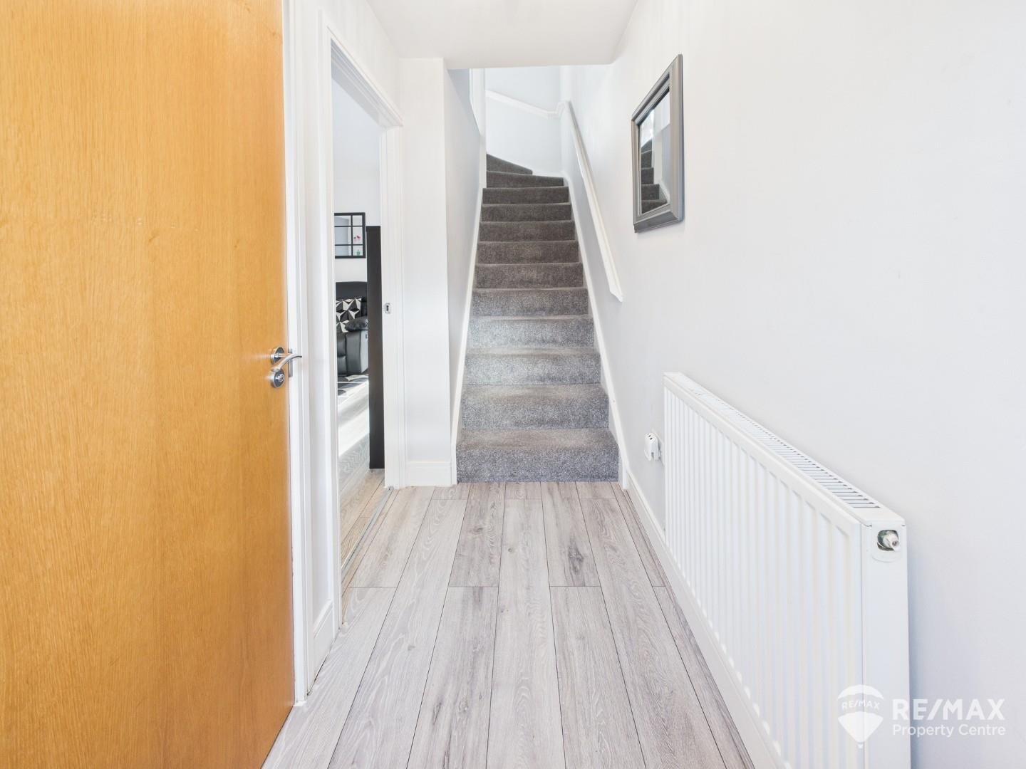 With radiator, staircase rising to the first floor, and doors leading to the downstairs WC and living room.