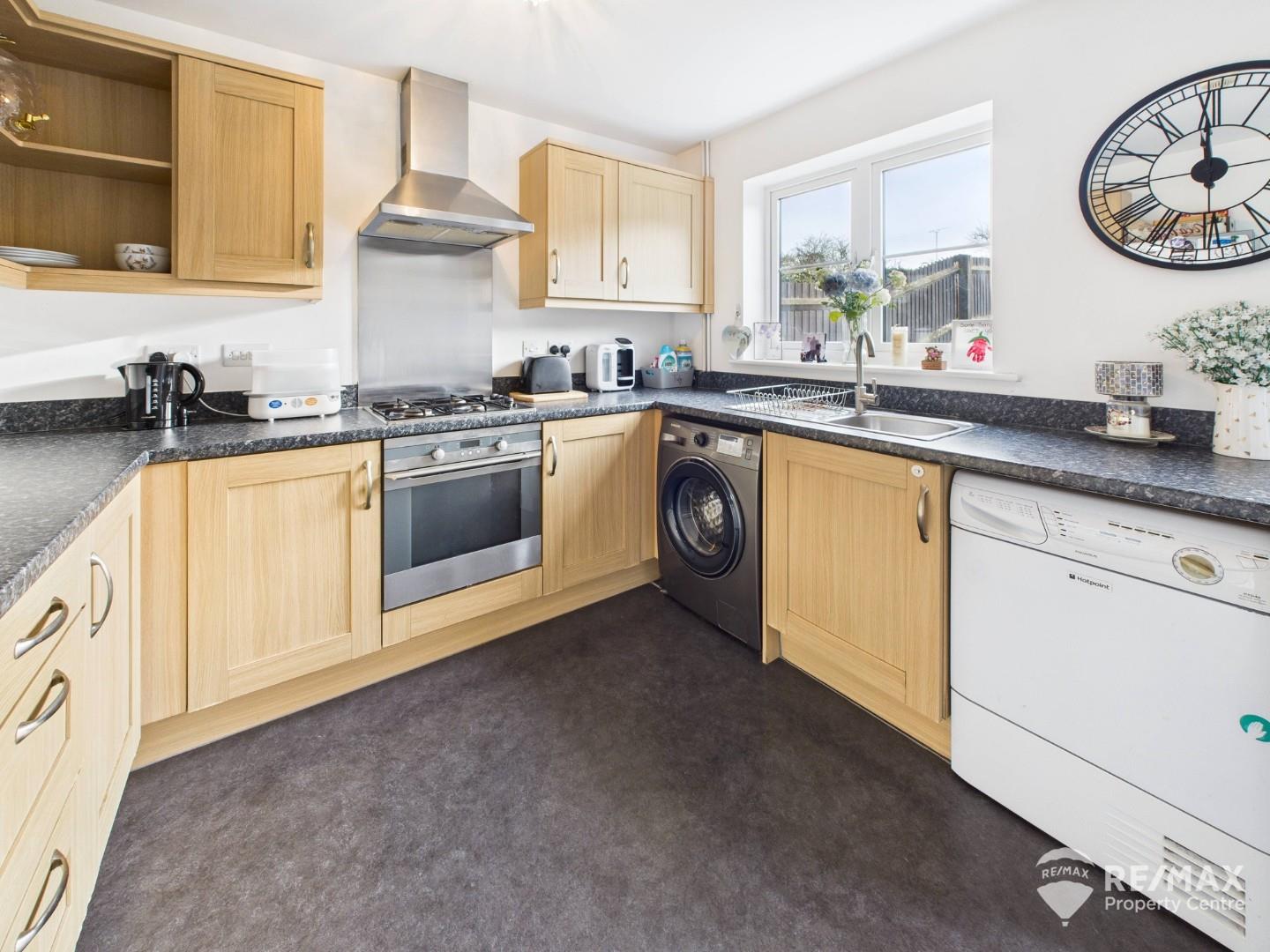 With space for a fridge/freezer, washing machine and tumble dryer or dishwasher, stainless steel sink and drainer, built-in oven, gas hob with extractor hood, and a range of base and eye-level cupboards. UPVC double glazed window to the rear, French doors opening onto the patio and garden, and a radiator