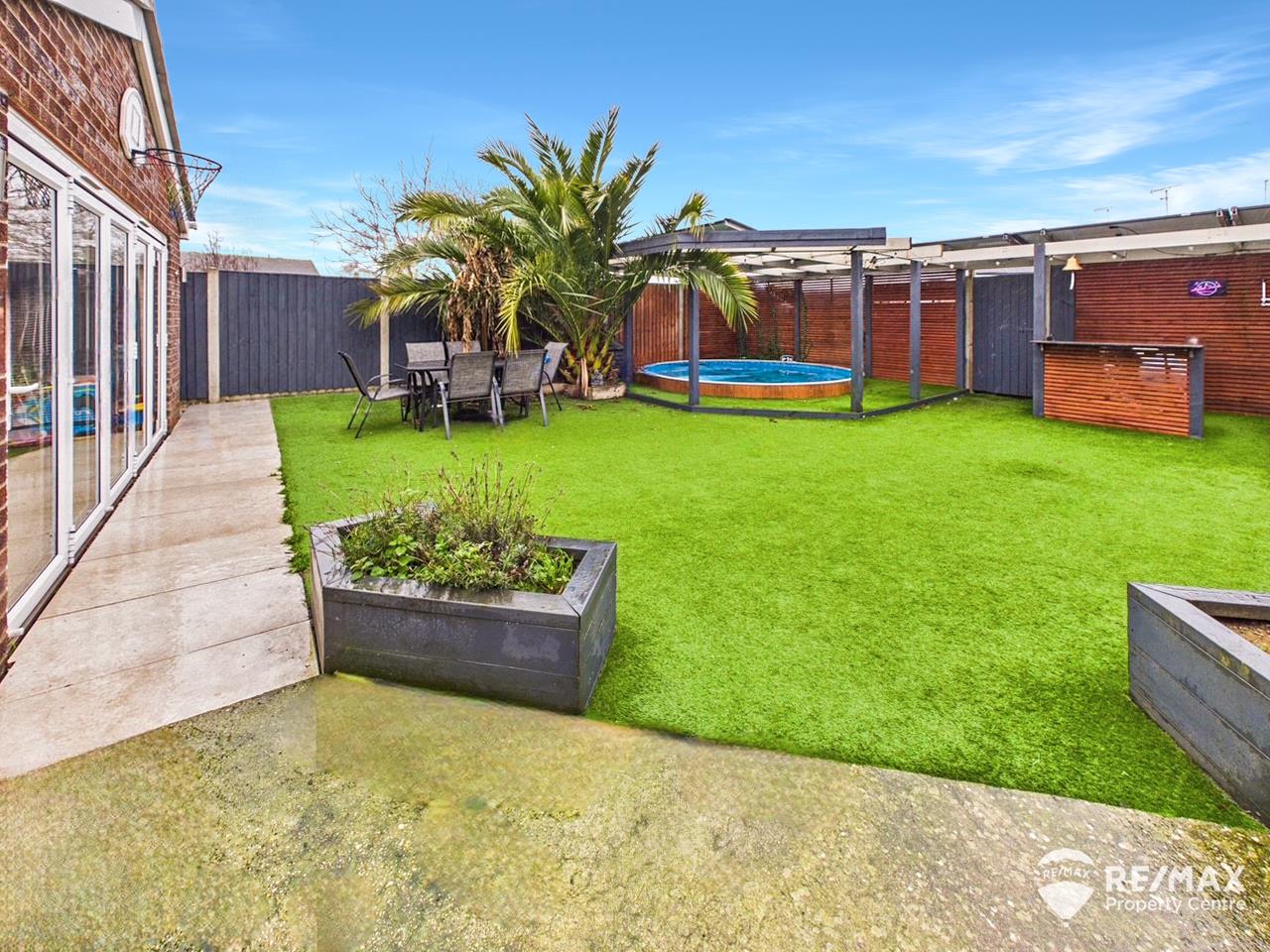 The South facing rear garden is fully enclosed with both side and rear access, pre-dominantly laid with low maintenance artificial grass, patio area, a wooden pergola, heated swimming pool, outside bar area, pond, storage shed (power connected)