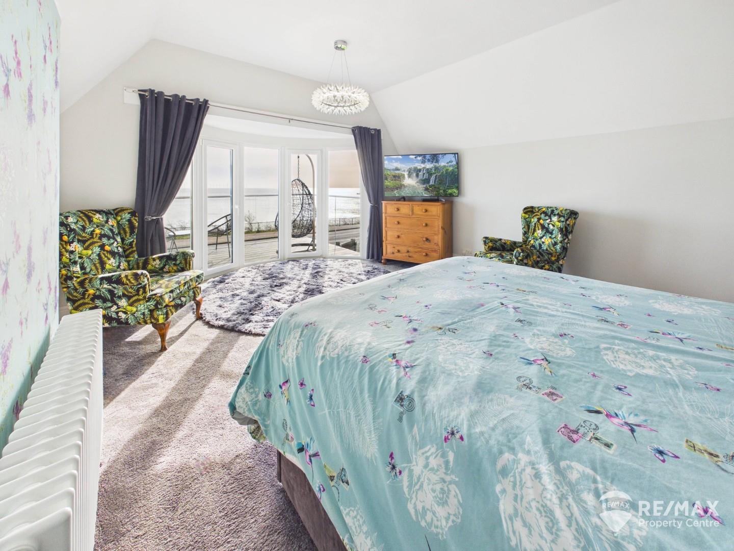A double bedroom with bay-fronted windows and doors opening onto a private balcony with glass panels, enjoying direct sea views.