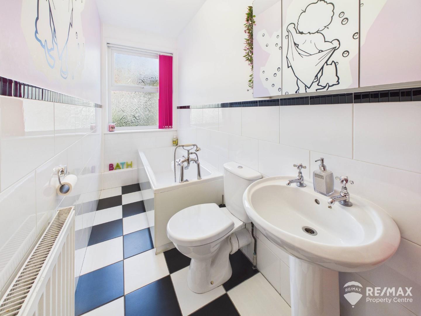 With an opaque window to the rear, low-level WC, panelled bath with mixer taps, pedestal wash basin, and radiator.