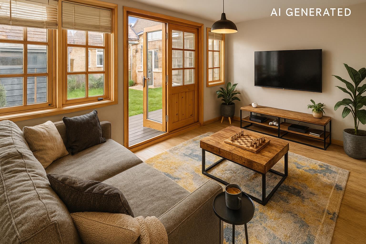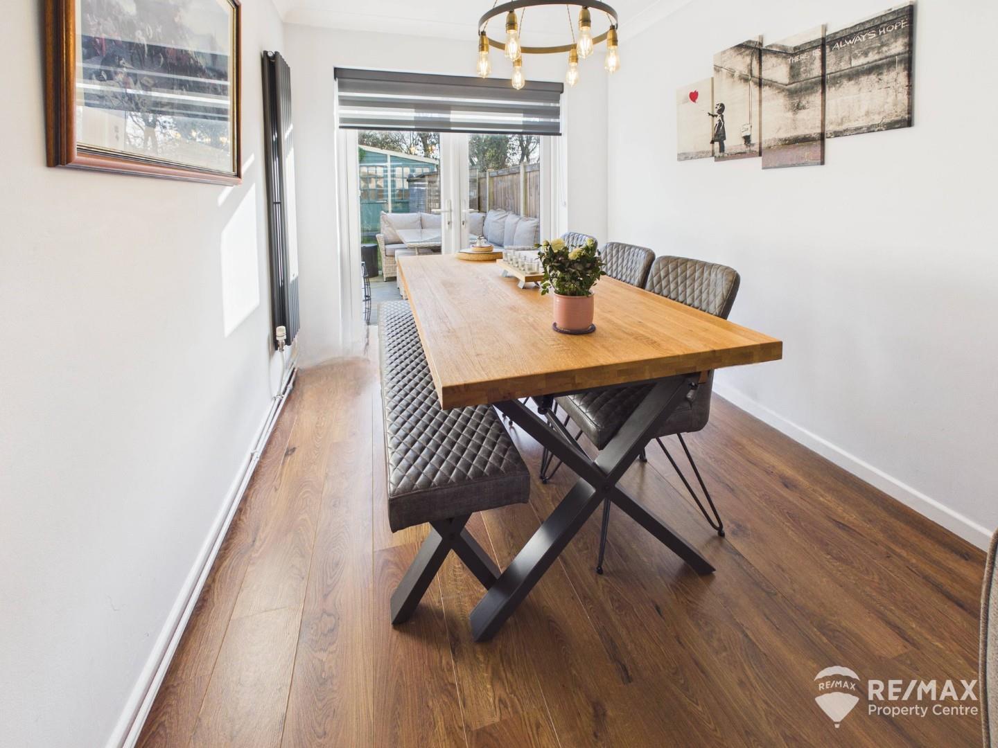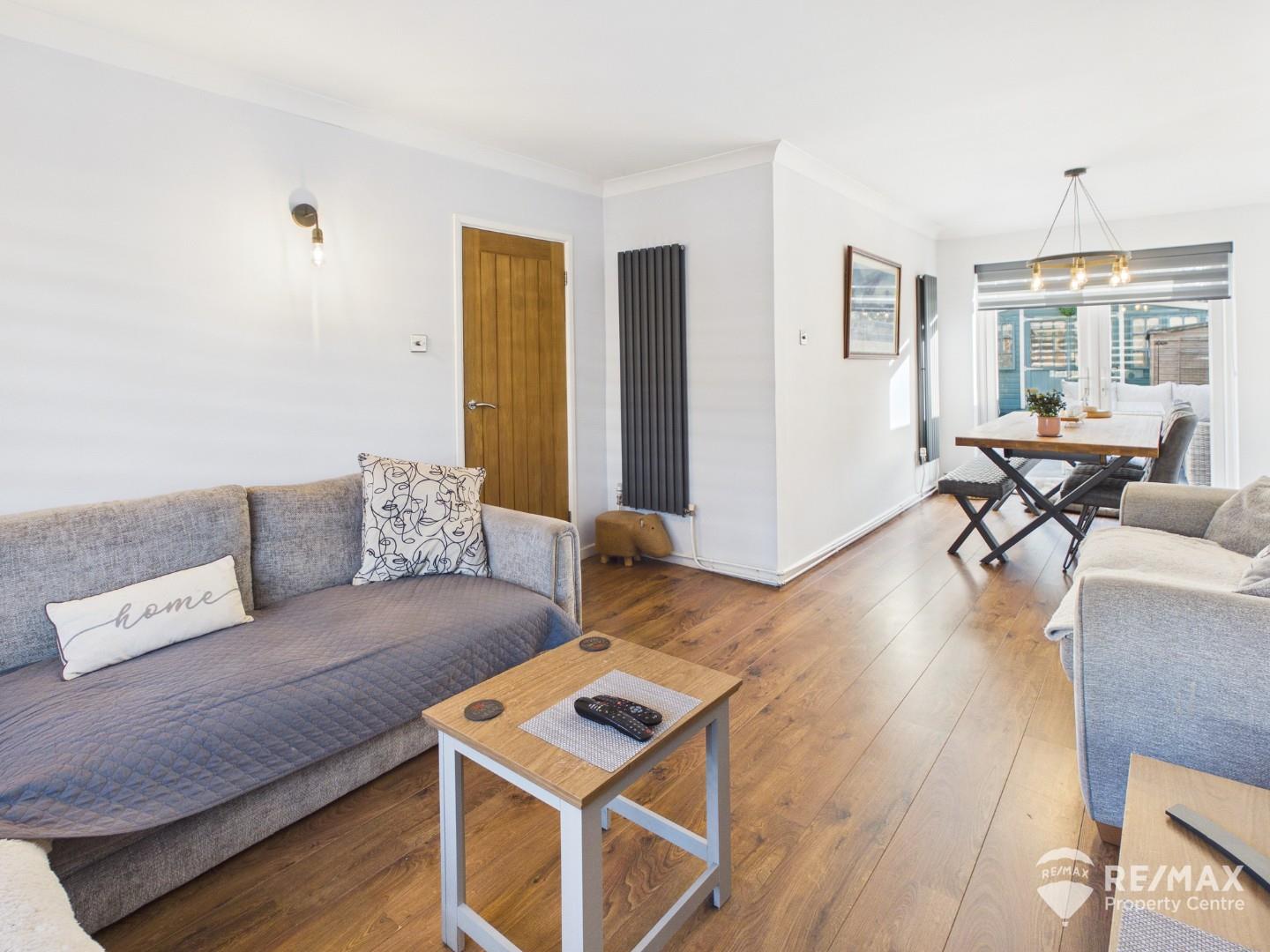 Extended dual-aspect living room with patio doors opening onto the rear garden, with ample space for both seating and dining.