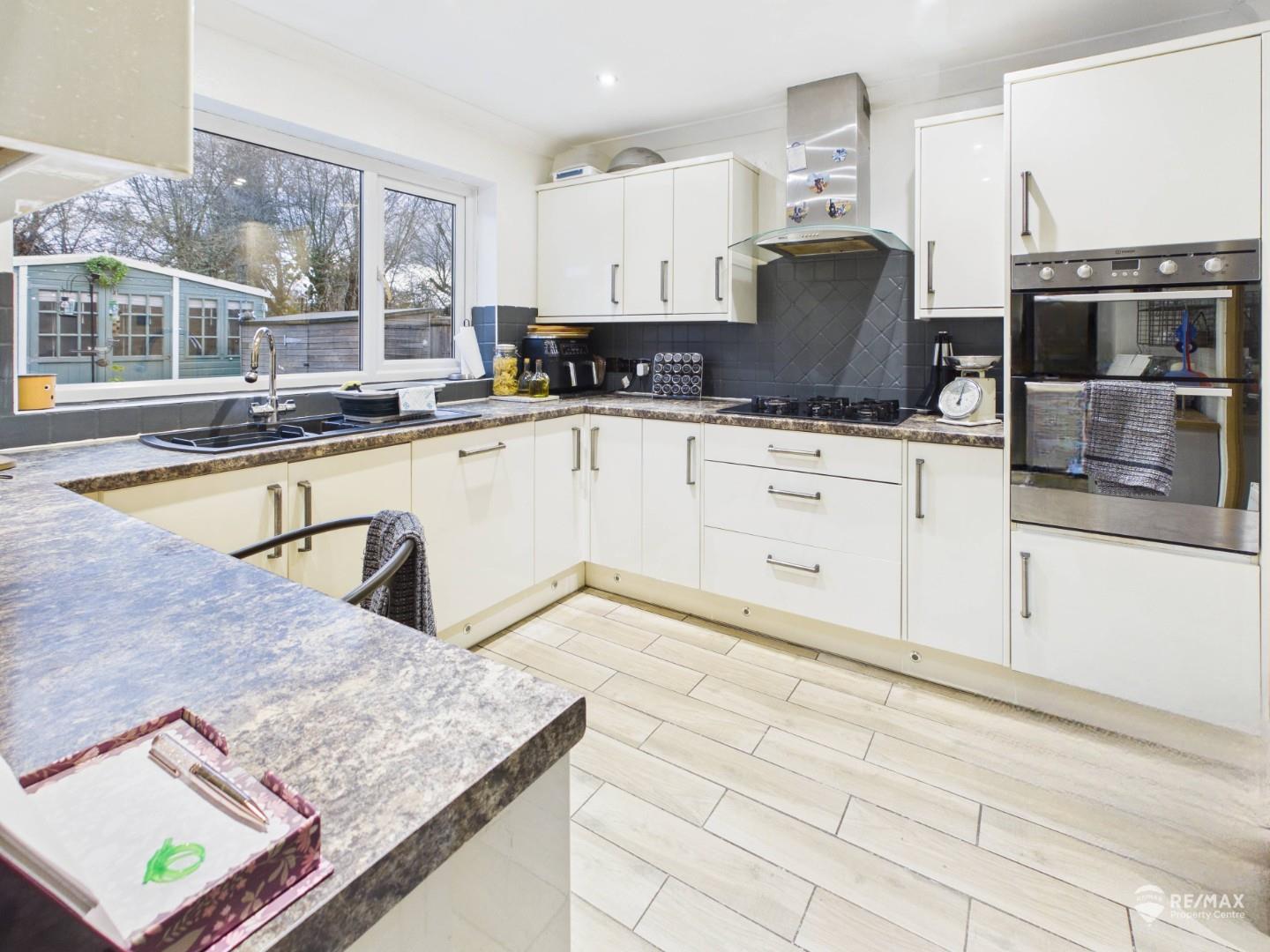Modern fitted kitchen with a range of units and work surfaces, overlooking the rear garden.