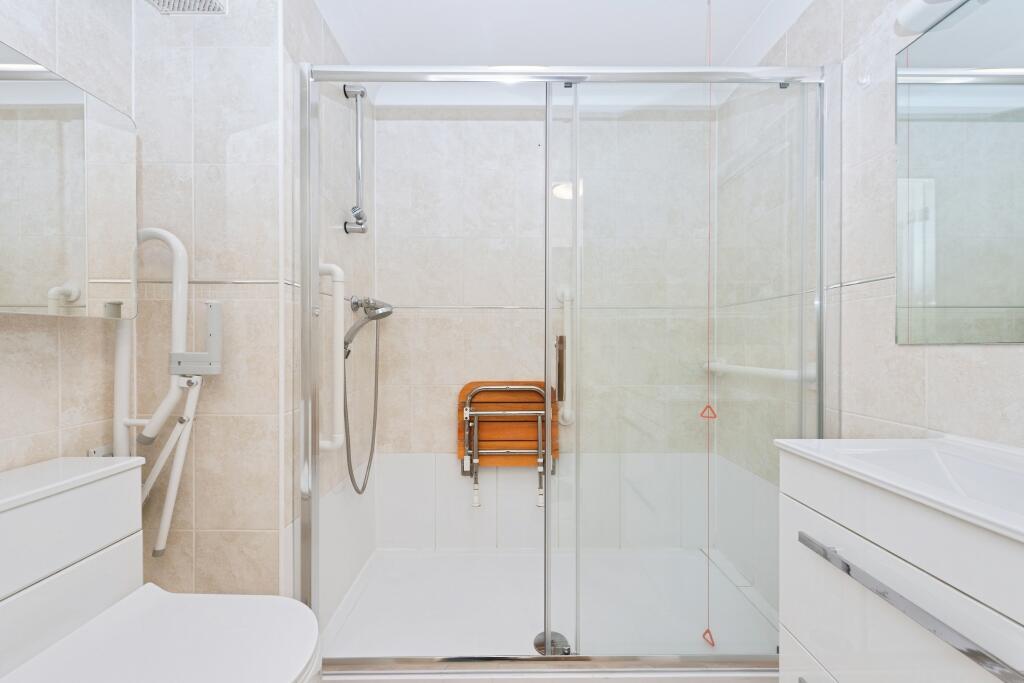 The shower room has been fitted with a clean, accessible suite including walk-in shower, wash basin and WC, designed with ease of use in mind.