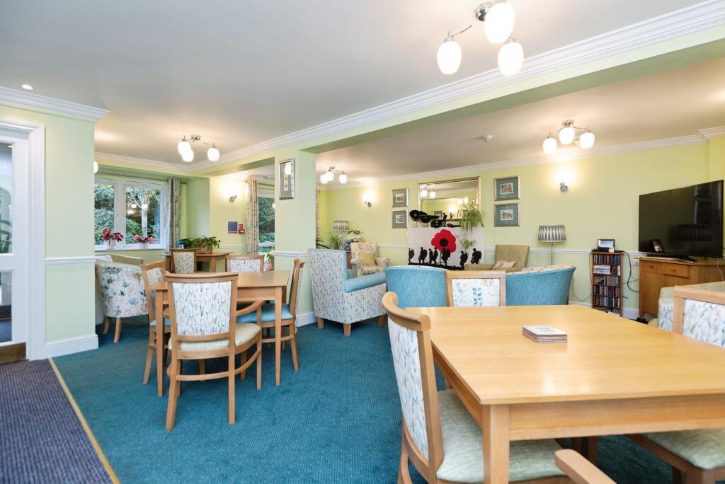 The living and dining room is generously proportioned and enjoys excellent natural light from large windows, creating a comfortable and inviting space for both relaxing and entertaining.