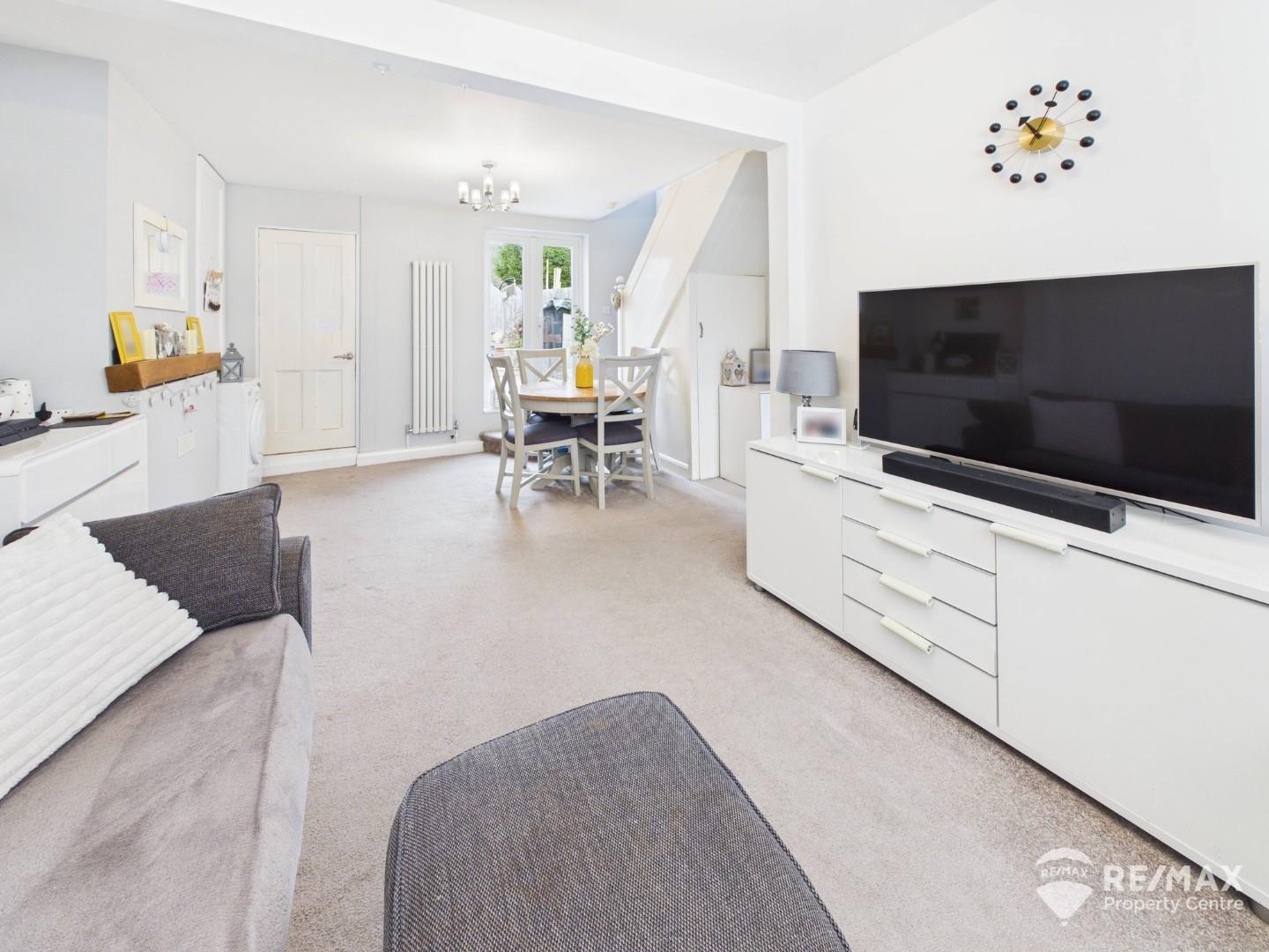 With double glazed windows to the front and double glazed French doors to the rear leading to the garden, under-stairs storage cupboard, additional storage cupboard, radiator and vertical radiator, stairs rising to the first floor, and door leading to the kitchen and bathroom.