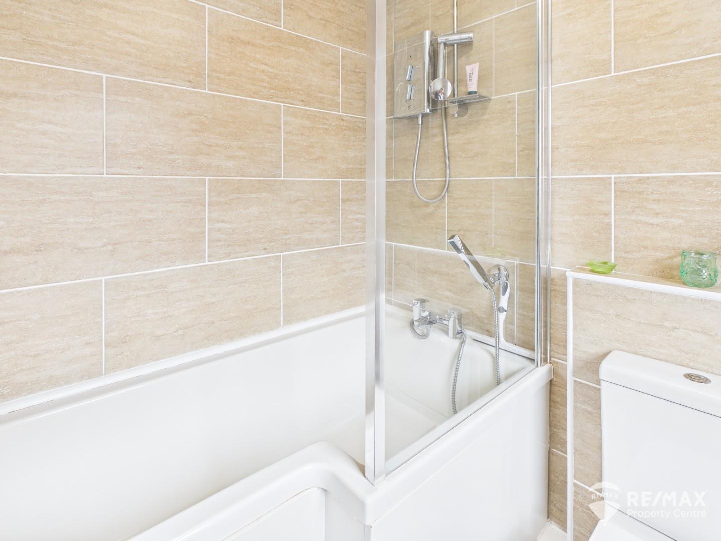 Fitted with a white suite comprising a ‘P’-shaped bath with mixer tap and shower attachment, pedestal wash basin, and low-level WC. Complementary tiling to the walls and a double glazed opaque window to the side.
