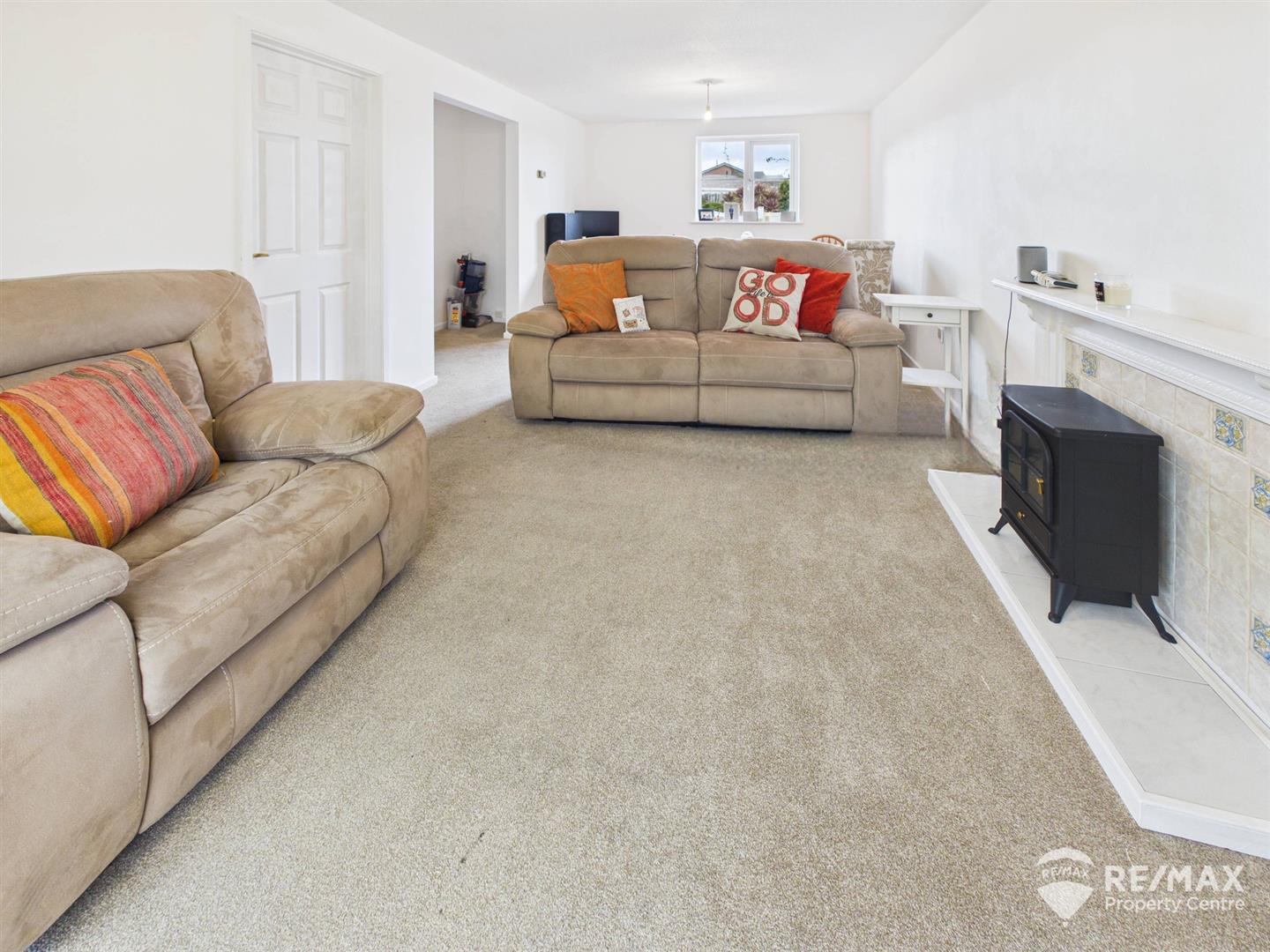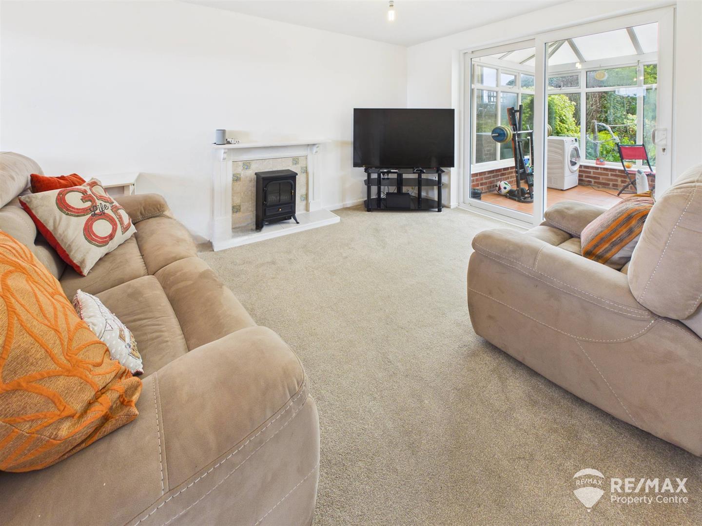 With tiled feature fireplace and surround, sliding patio doors leading to sunroom, doors to hallway and kitchen, window to front aspect