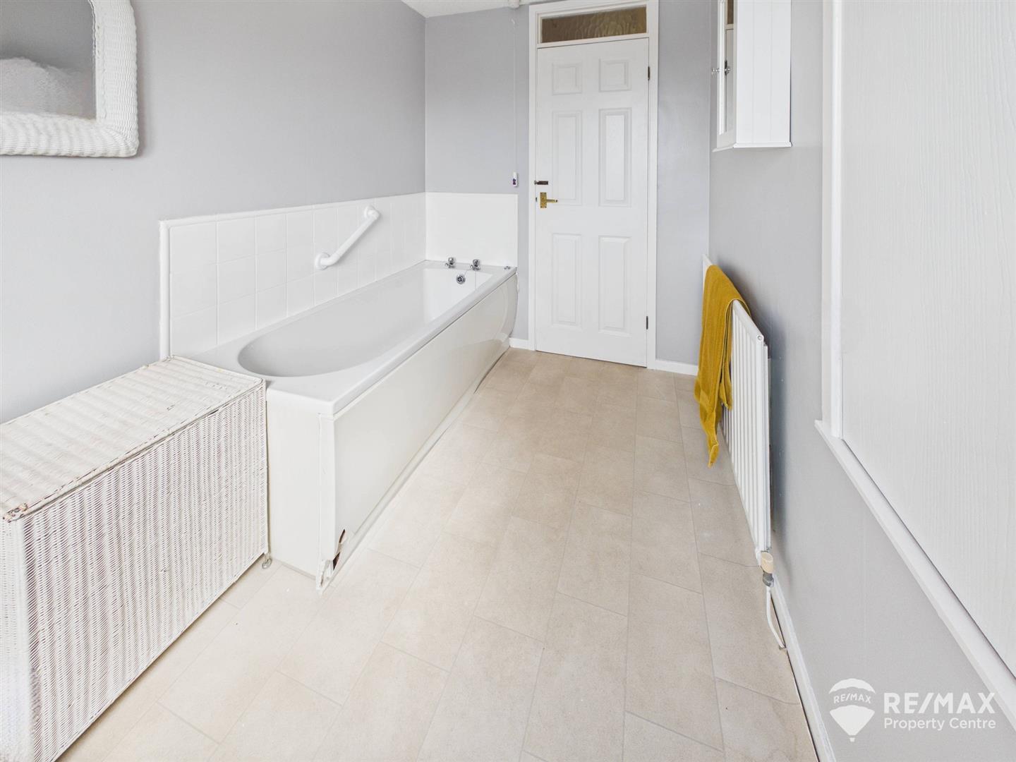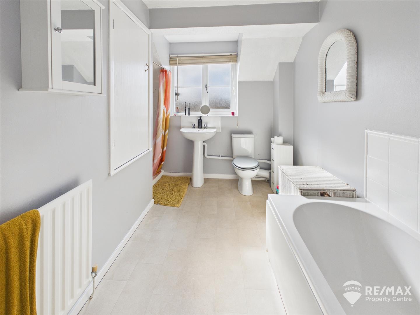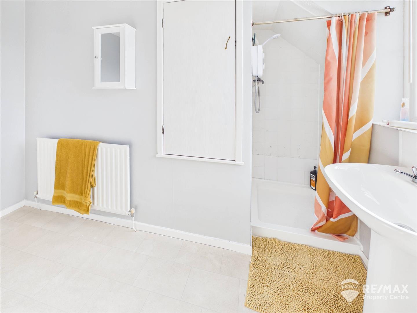 4 piece suite comprising panelled bath, shower cubicle with newly fitted electric shower, low level WC and pedestal wash basin, built in airing cupboard and opaque window to front aspect