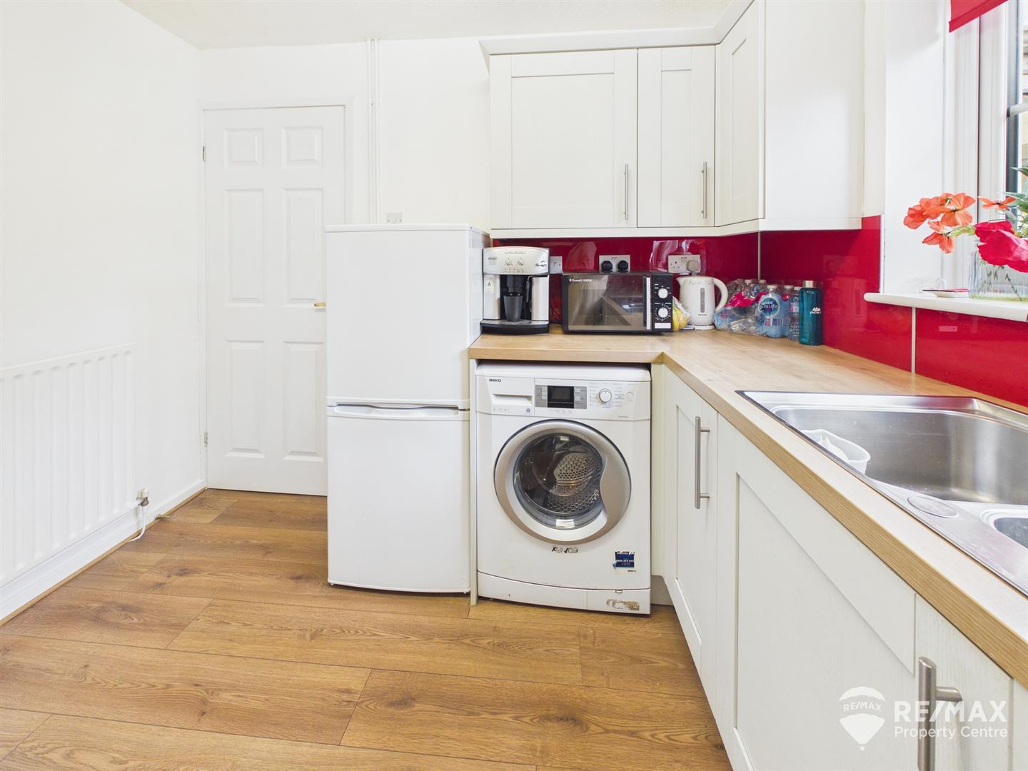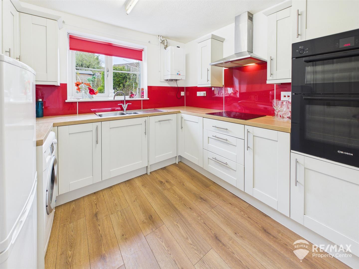 Modern range of shaker style wall and base units, stainless steel one and a half bowl sink/drainer with mixer tap, fitted double oven, integrated dishwasher, spaces for fridge/freezer and washing machine, gloss splash back, wall mounted gas boiler (approx. 3 years old) window to rear aspect
